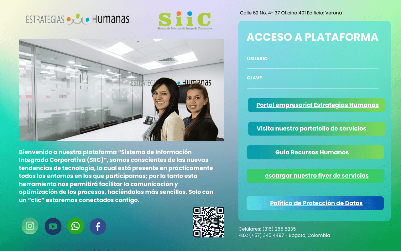 A nuestra plataforma “Sistema de Información Integrada Corporativa (SIIC)”, somos conscientes de las nuevas tendencias de tecnología, la cual está presente en prácticamente todos los entornos en los que participamos; por la tanto esta herramienta nos permitirá facilitar la comunicación y optimización de los procesos, haciéndolos más sencillos. Solo con un “clic” estaremos conectados contigo.